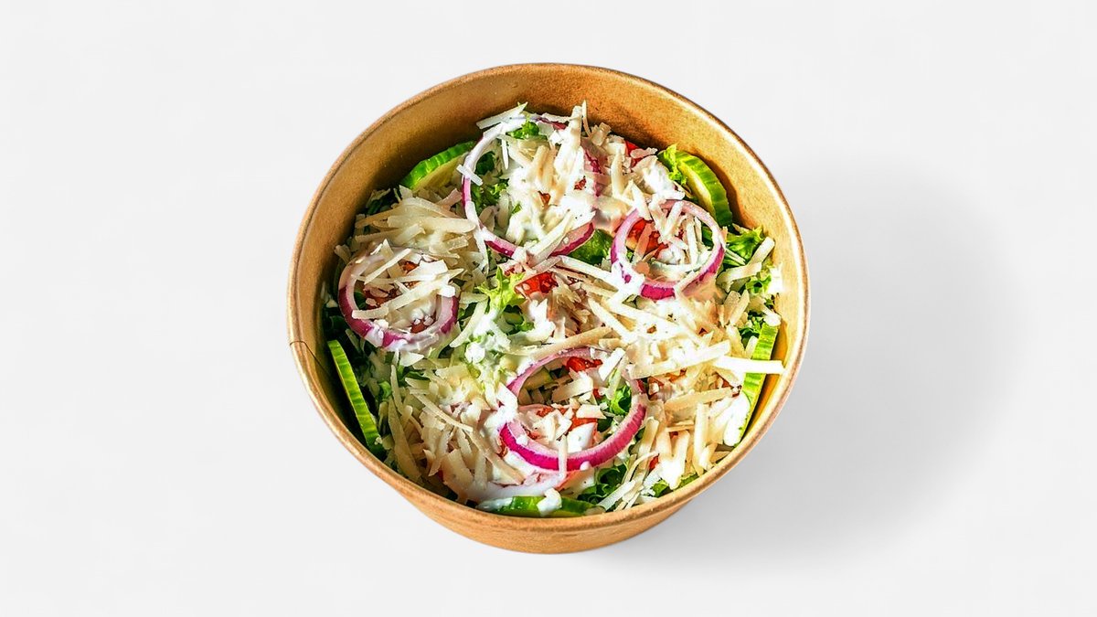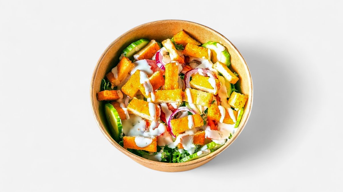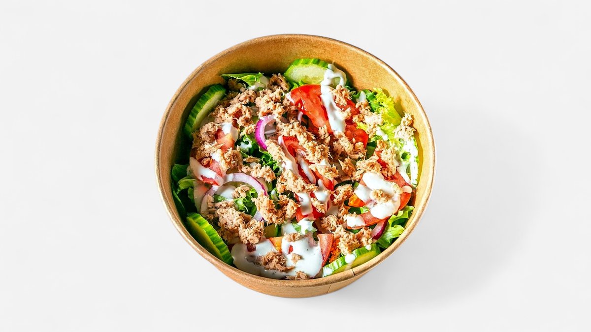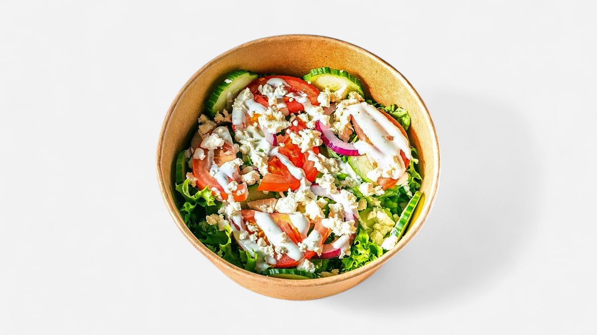 Alle Salate werden mit Lollo Rosso, roten Zwiebeln, Tomaten, Gurken, Rucola und Joghurt-Dressing zubereitet