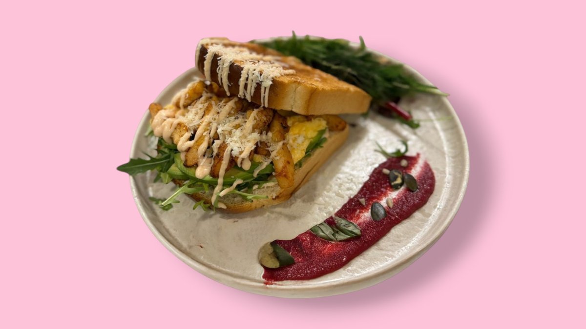 Brioche, Rührei mit Trüffelöl, Chicken, Avocado und Chili Mayo