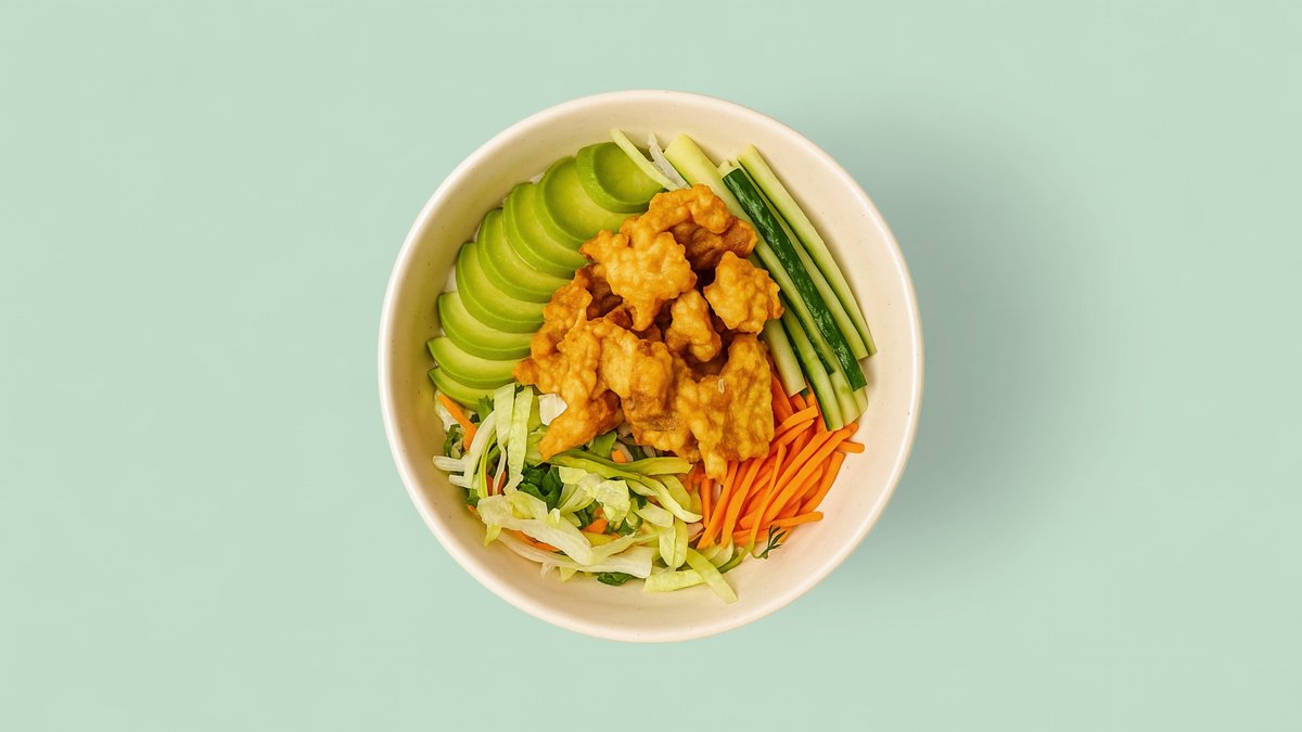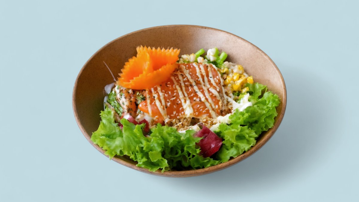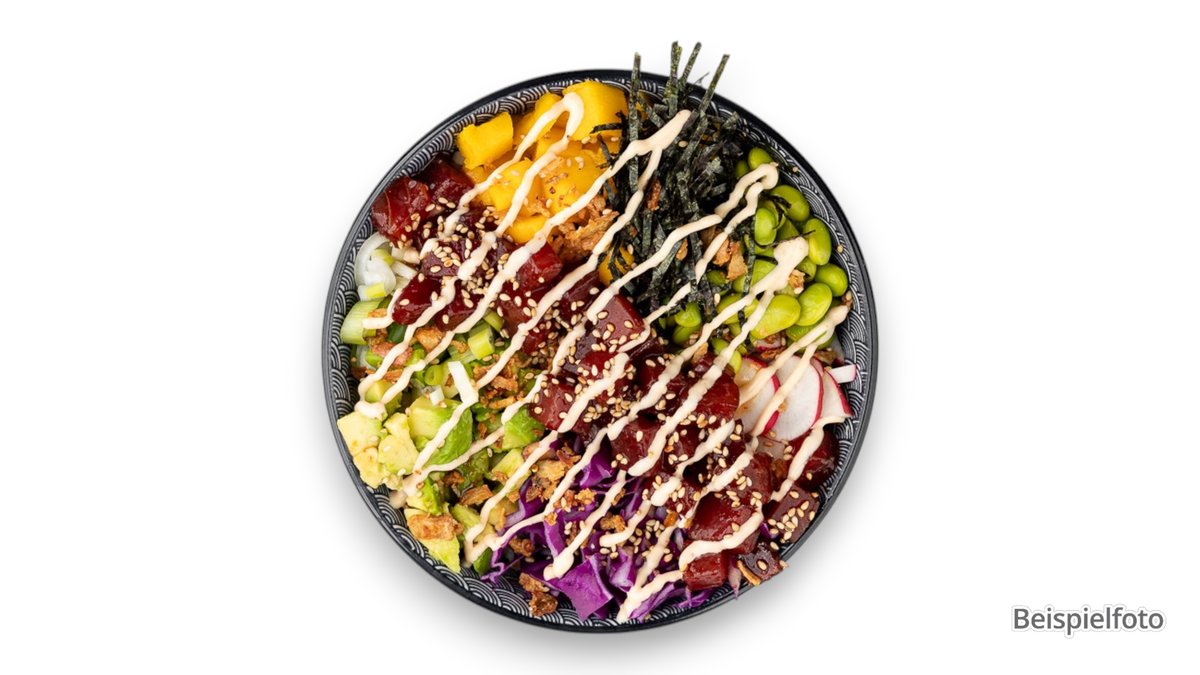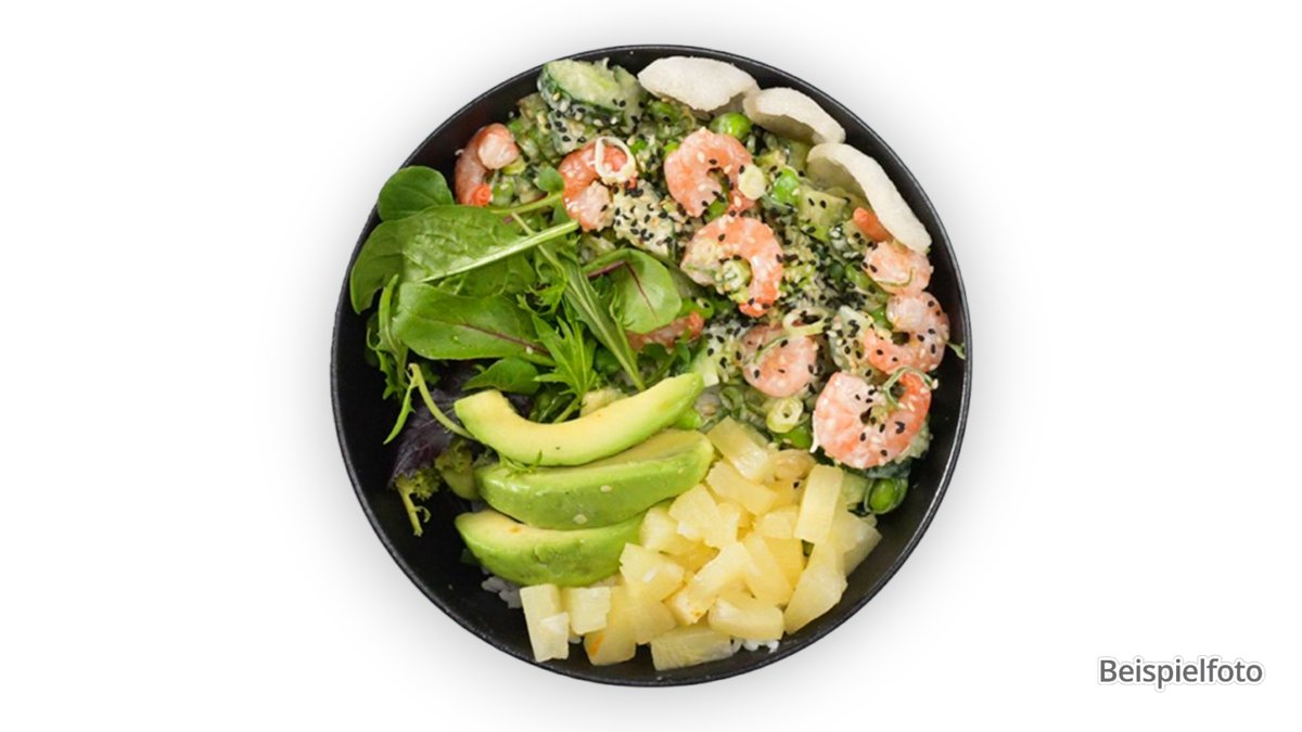 alle Bowls werden mit saisonalem Salat, Gurken, Edamame, Avocado, Mango, hausgemachtem Dressing, Sesam, Erdnüssen, Cocktailsoße und Unagi-Soße zubereitet