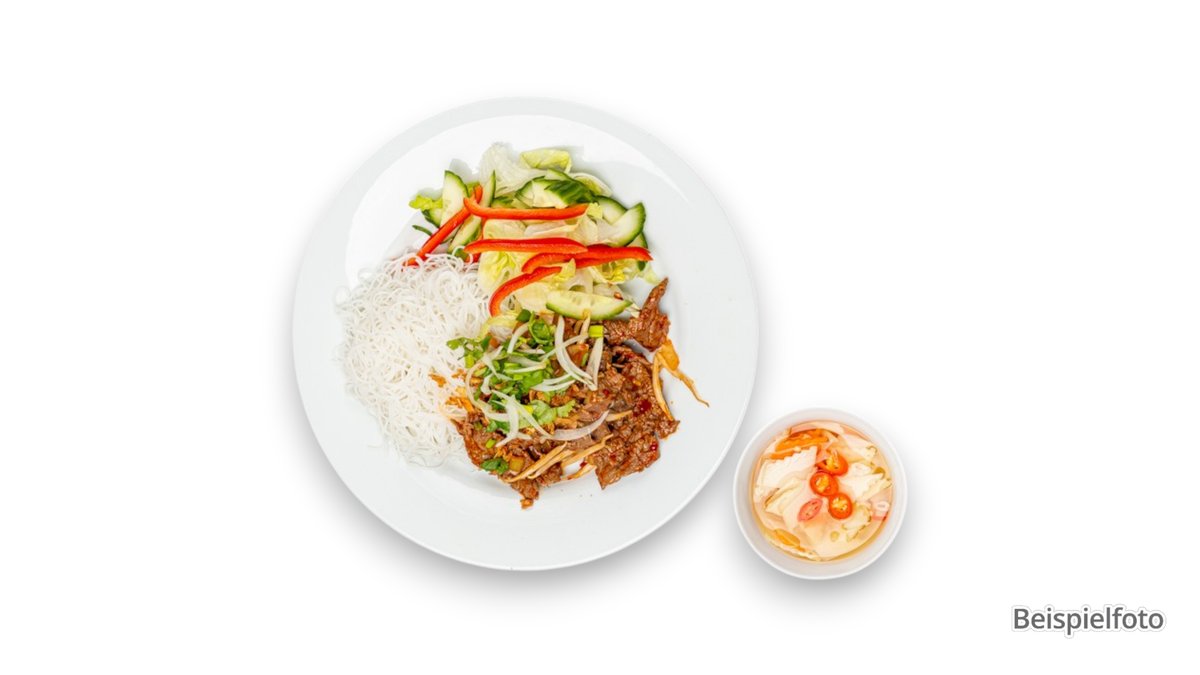 mit Glasnudeln, Gurken, roter Paprika, Sojasprossen und Röstzwiebeln
