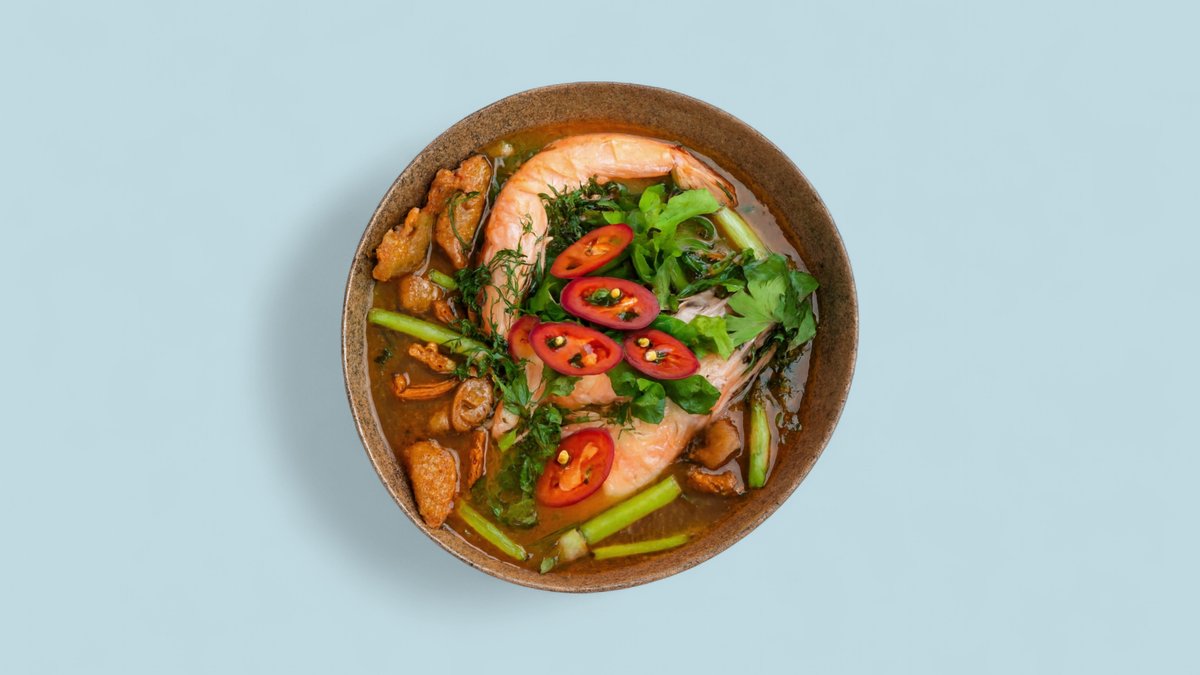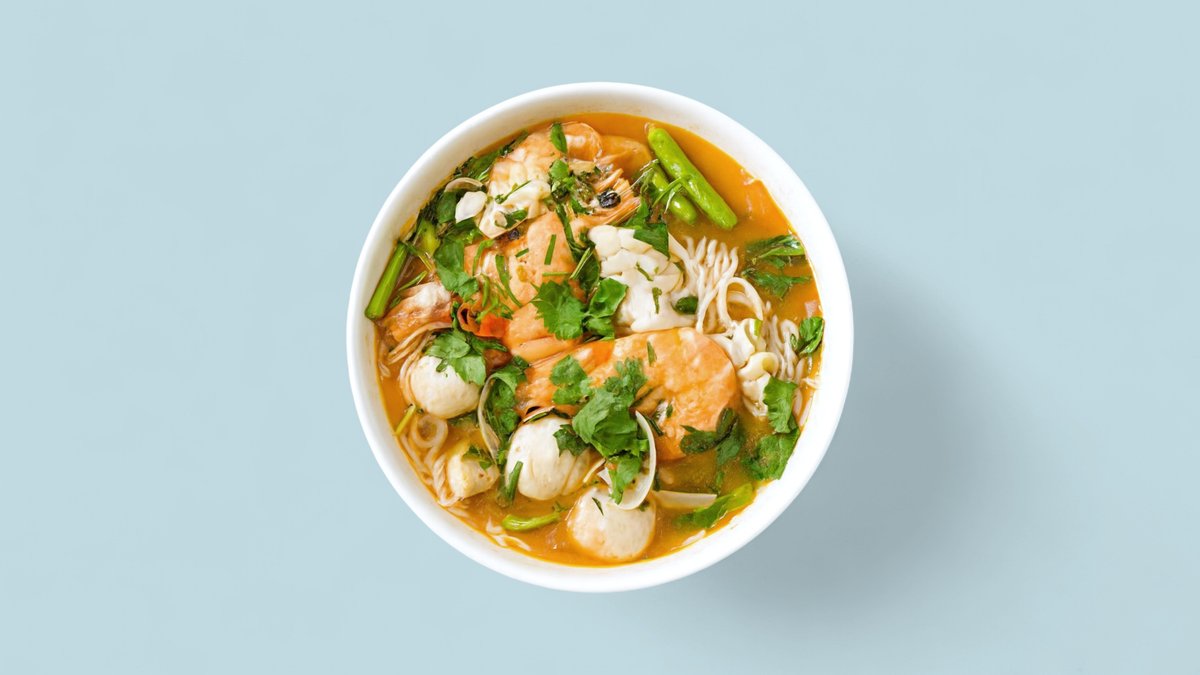 Reisnudelsuppe mit Meeresfrüchten, Garnelen, Lachs, Venusmuscheln, Tintenfisch, Zucchini, Tomaten, Ananas, Dill und Koriander