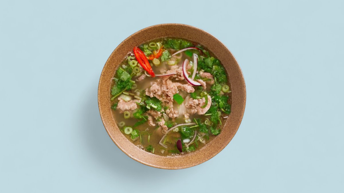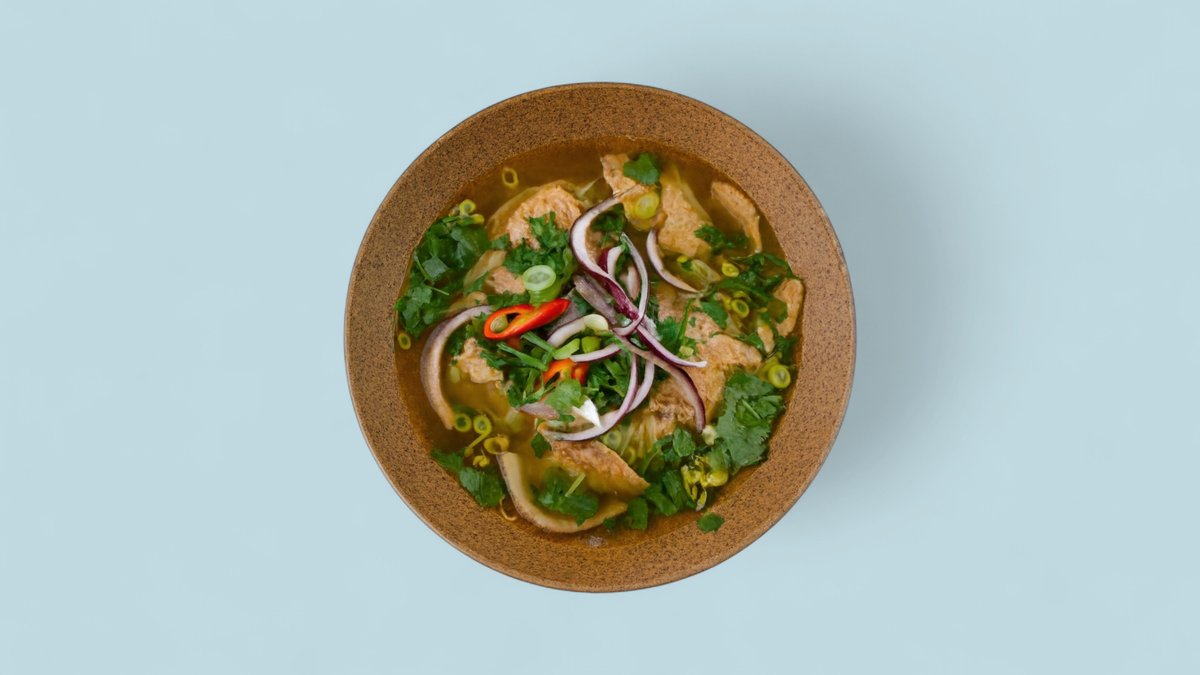 Reisnudelsuppe mit Lachs, Tomaten, Ananas, Sellerie, Sojasprossen, Dill, vietnamesischen Kräutern und Koriander
