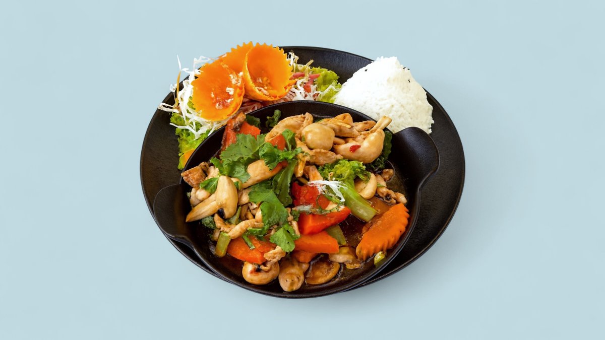 mit Hähnchen, Frühlingszwiebeln, Pilzen, gefüllten Teigtaschen, Koriander und Gemüse