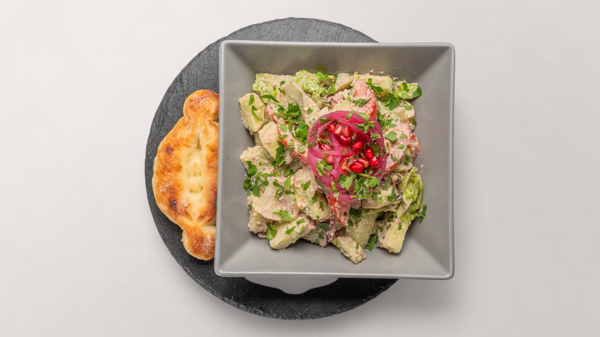 alle Gerichte werden mit georgischem Brot serviert („Gebjalia”, „Georgischer Salat” und „Tschwischtari” werden ohne georgischen Brot serviert)
