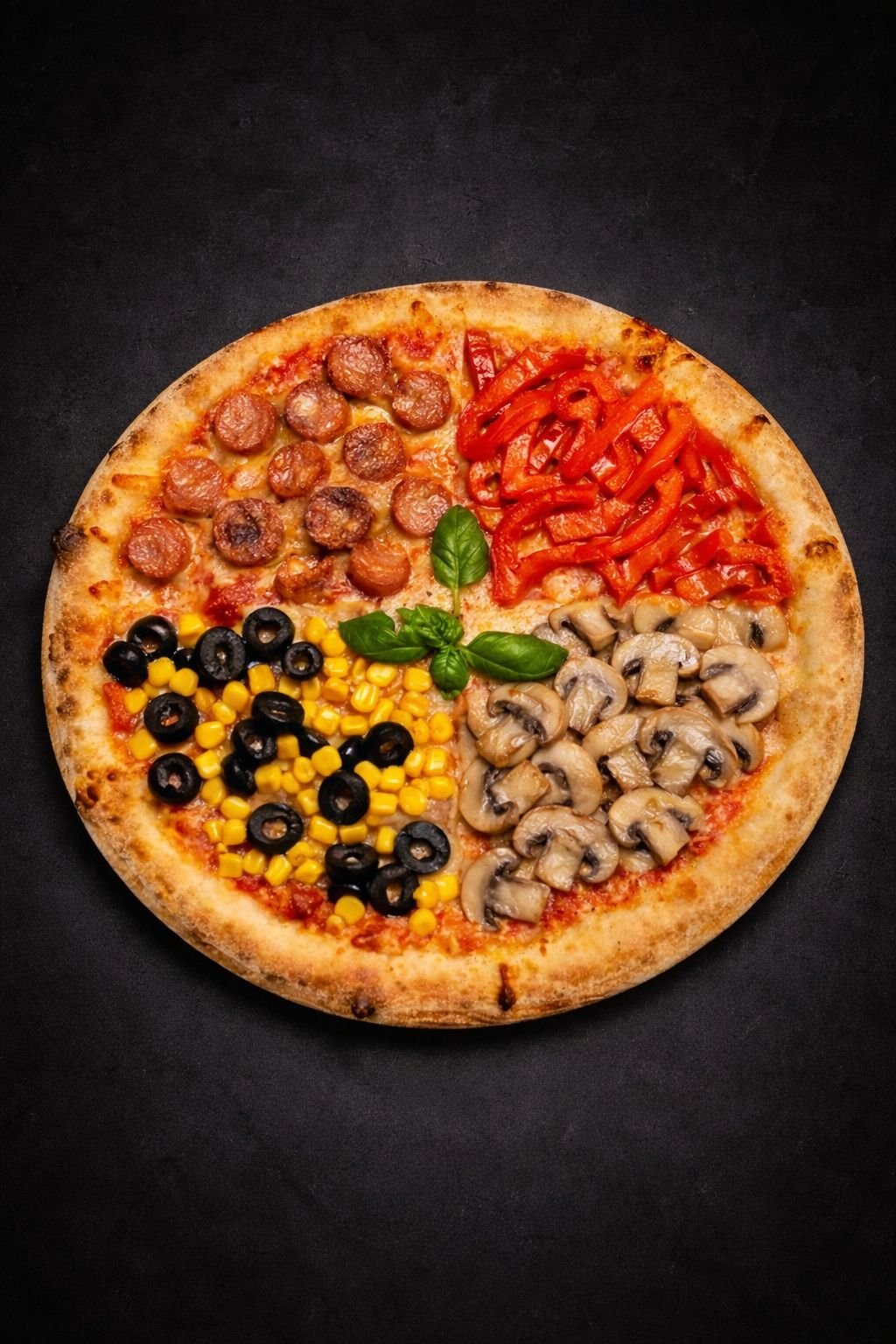 Mozzarella käse-Paprika-Mais-Frischen Tomaten-Knoblauchwurst-oliven-Champignons
