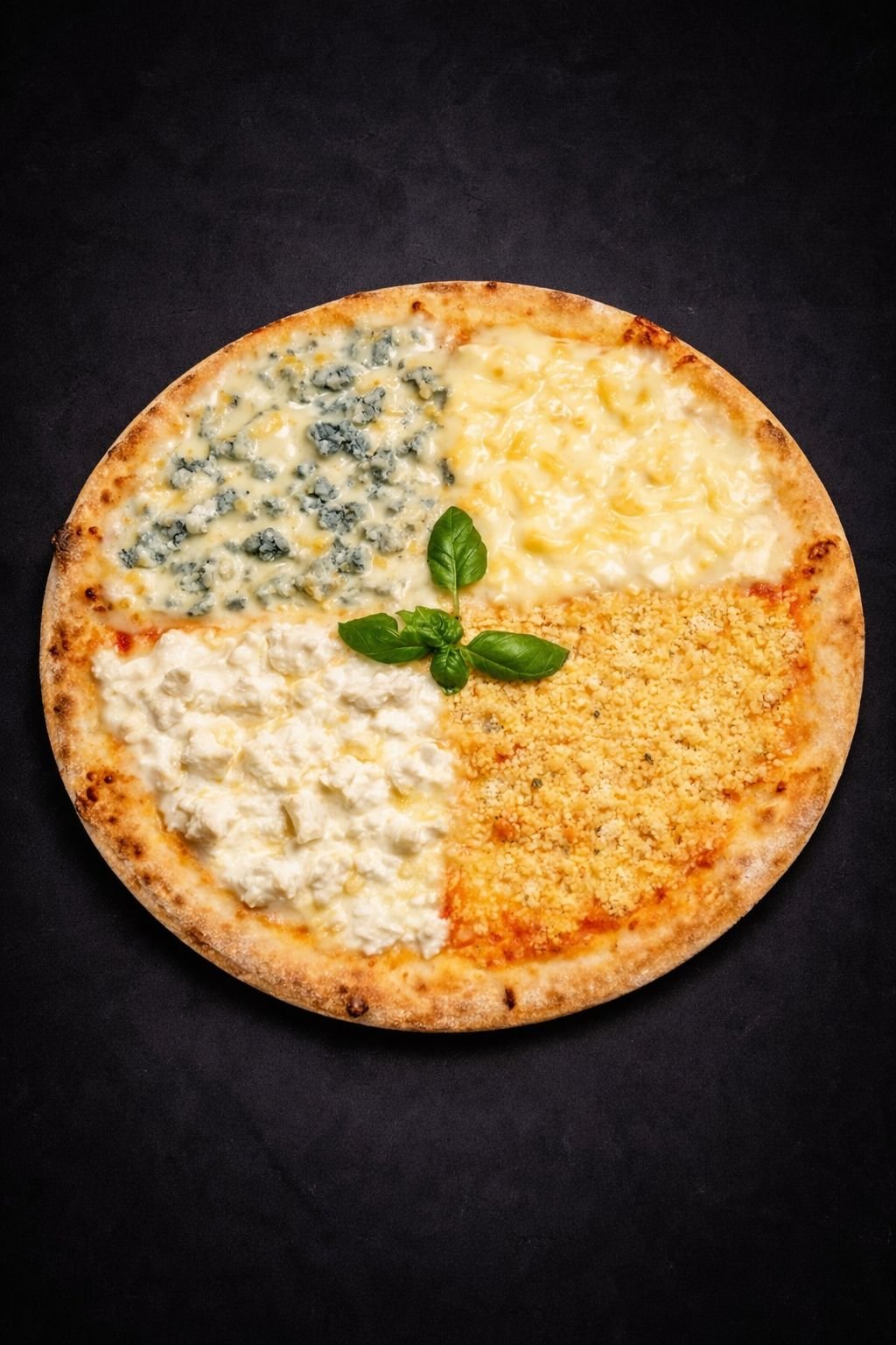 Tomatensauce, Mozzarella, Gorgonzola, Parmesan, Emmentaler.