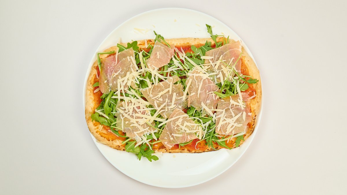 mit Parmaschinken, Champignons, Rucola und Parmesan