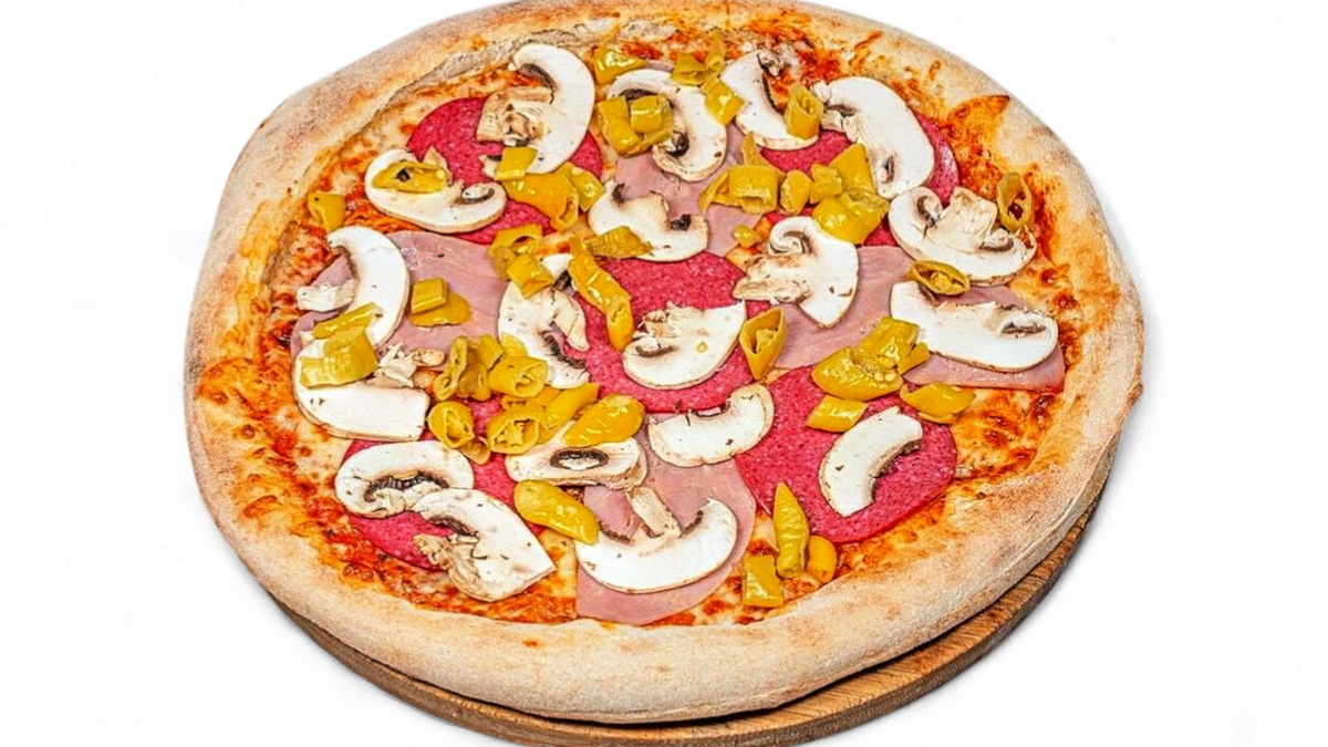 mit Salami, Putenschinken, frischen Champignons, Peperoni, Tomatensoße und Mozzarella