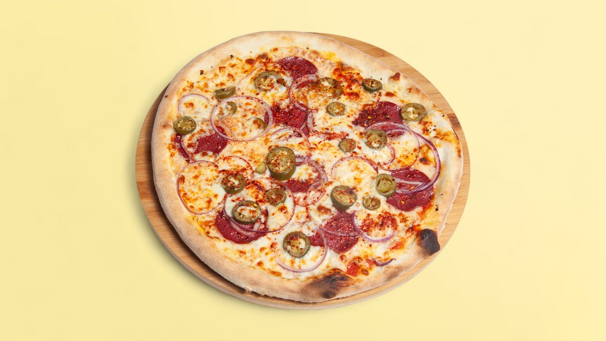mit Salami, Putenschinken, frischen Champignons, Peperoni, Tomatensoße und Mozzarella