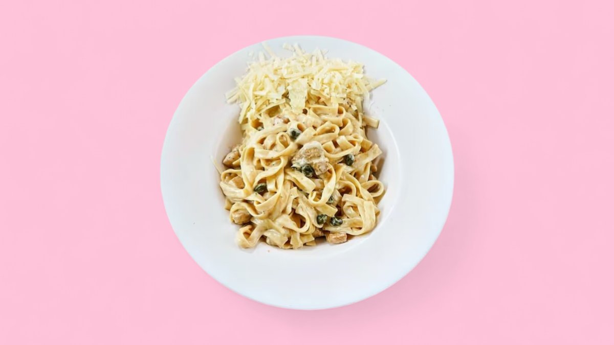 mit Hähnchenbruststreifen, Kapern, Sahnesoße und Bandnudeln