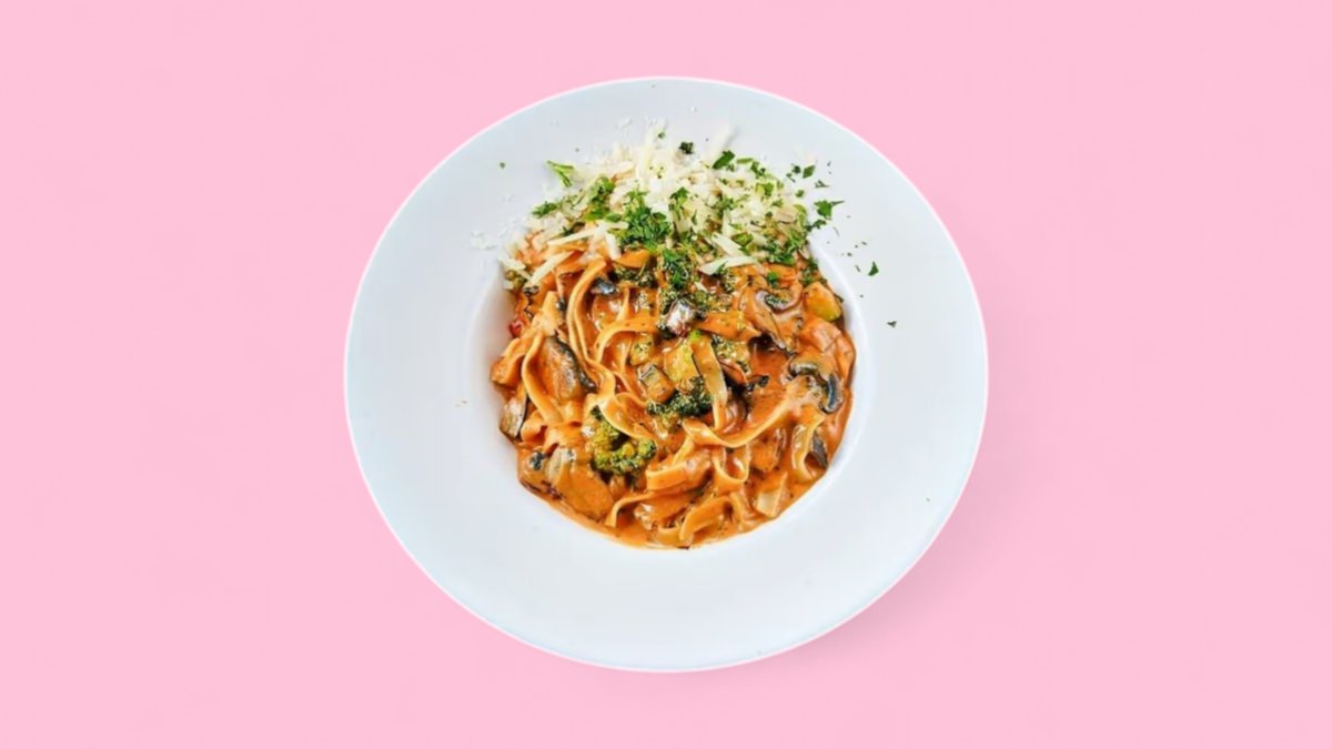 mit Gartengemüse, Tomaten-Sahnesoße und Bandnudeln