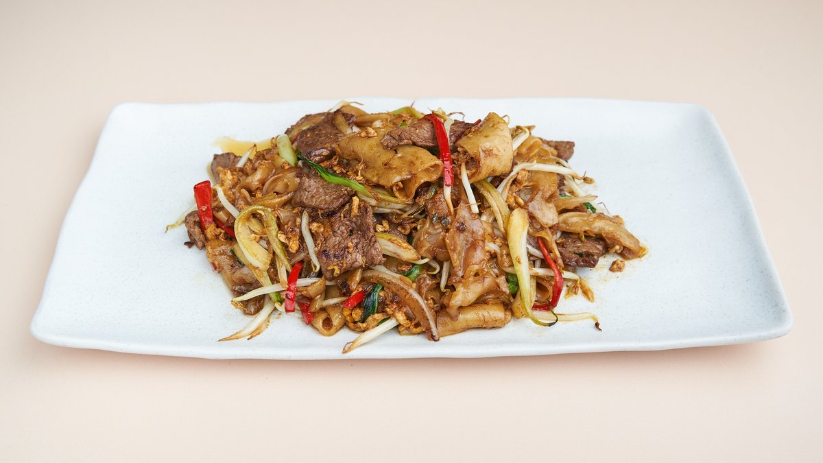 hausgemachte gebratene breite Reisnudeln mit Rinderfilet und Gemüse