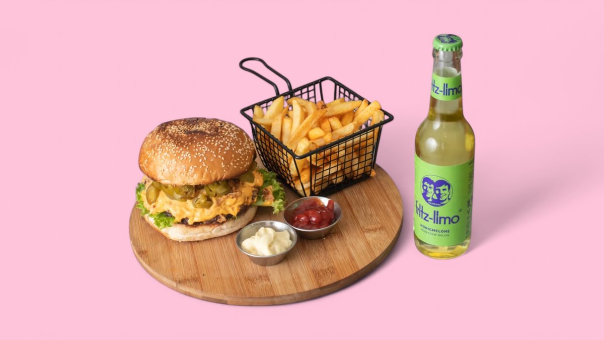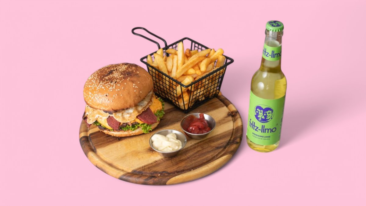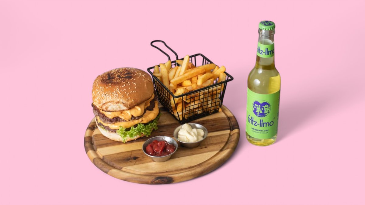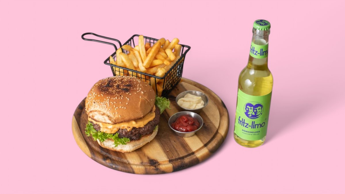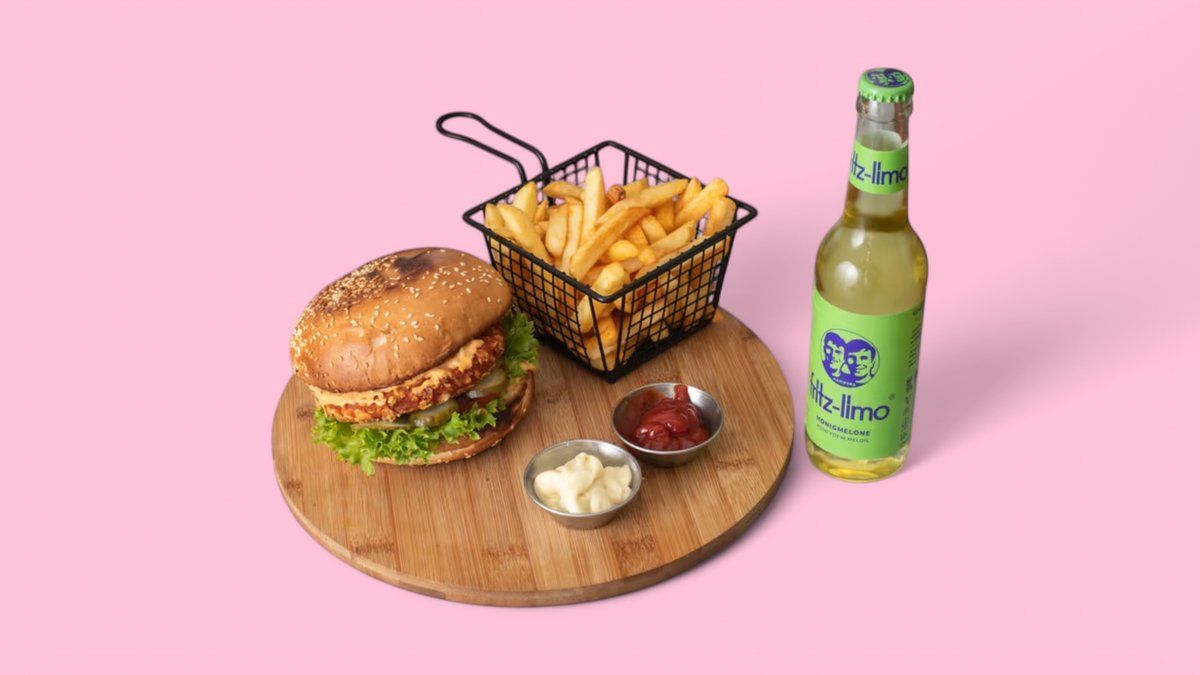 alle Menüs werden mit einem Burger, Pommes frites und einem Getränk 0,33 l deiner Wahl serviert