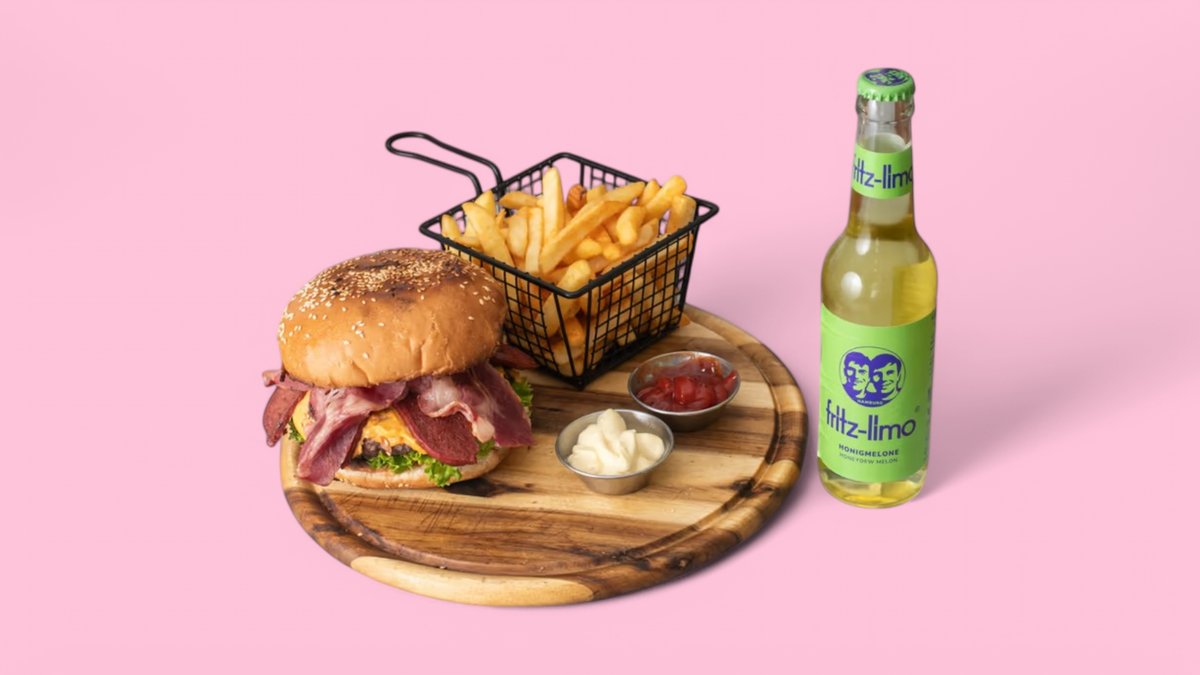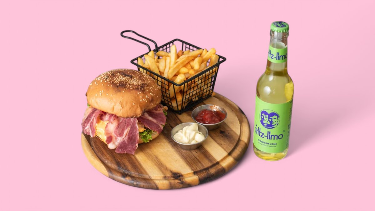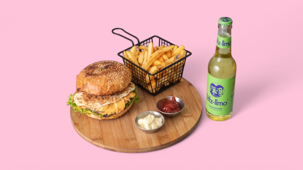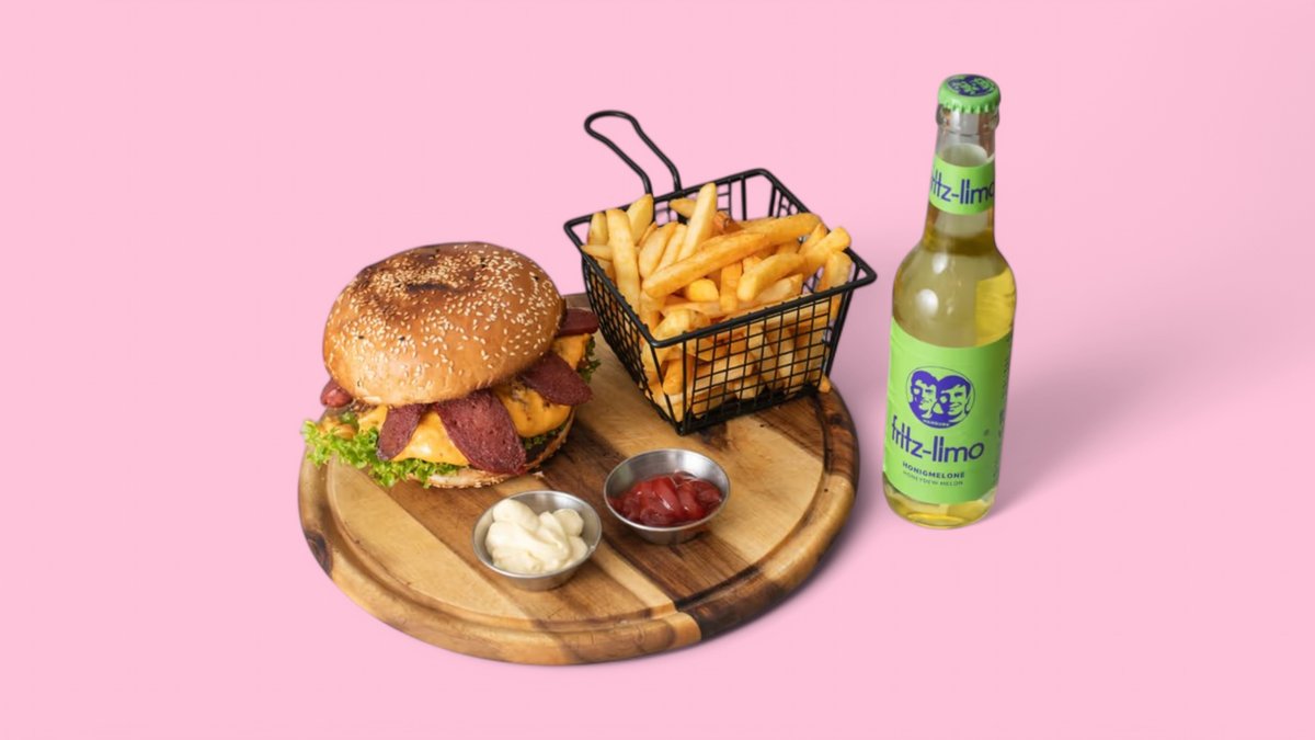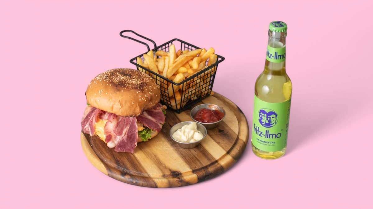 alle Menüs werden mit einem Burger, Pommes frites und einem Getränk 0,33 l deiner Wahl serviert