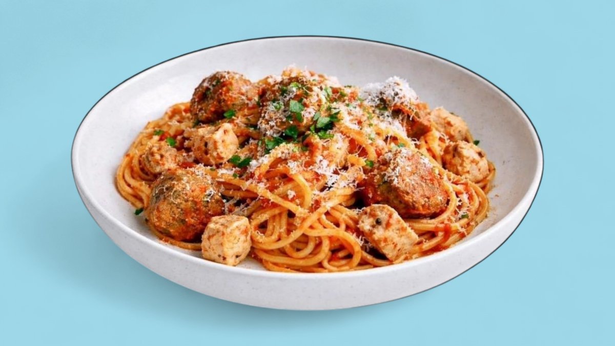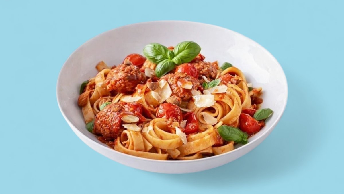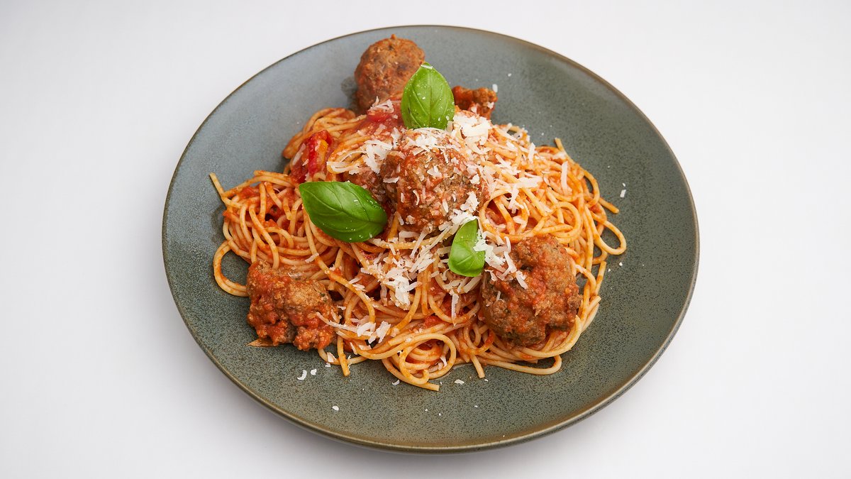 Pastasorte deiner Wahl in einer würzigen Tomatensoße mit feinem Chili, Knoblauch und frischem Basilikum, serviert mit saftigen Rinderhackbällchen und gekrönt mit frisch geriebenem Parmesan
