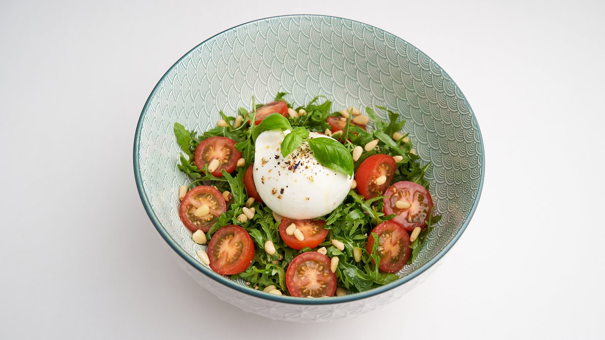 cremige Burrata auf Rucola und sonnengereiften Tomaten, veredelt mit feinem Olivenöl, Meersalz, gerösteten Pinienkernen und rosa Pfeffer-Mix