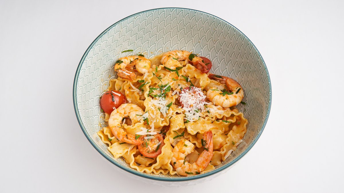 Bandnudeln Mafaldine mit großen Garnelen, sautiert in Weißwein, Knoblauch und Chili, verfeinert mit frischem Limettensaft, saftigen Kirschtomaten und aromatischer Hummerbutter, abgerundet mit Petersilie und frisch geriebenem Parmesan Enthält Alkohol, für Kinder und schwangere Frauen nicht geeignet