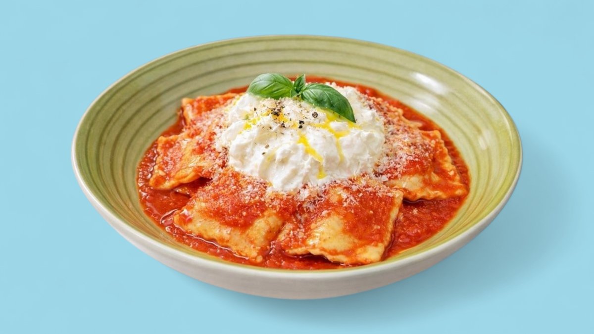 mit Ricotta und Spinat gefĂĽllte, frische Ravioli, serviert in einer cremigen Tomaten-CremesoĂźe, verfeinert mit frisch geriebenem Parmesan und zartschmelzender Burrata