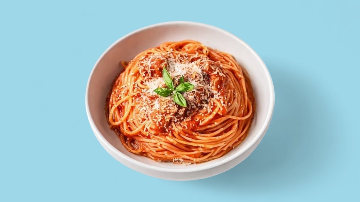 mit einer Pastasorte deiner Wahl, klassischer, aromatischer TomatensoĂźe, frischem Basilikum und frisch geriebenem Parmesan