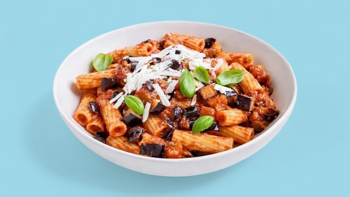 Pastasorte deiner Wahl mit goldbraun frittierten Auberginen, verfeinert mit Olivenöl, Chili, Knoblauch und frischem Basilikum in einer aromatischen Tomatensoße, gekrönt mit geriebenem Ricottasalatn.