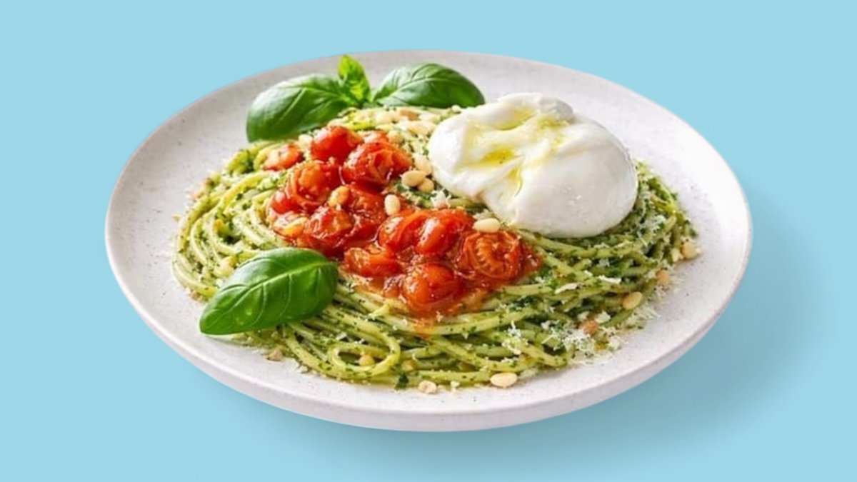 Pasta deiner Wahl Serviert mit aromatischem hausgemachten Basilikum-Pesto, geschmolzenen Kirschtomaten, gerösteten Pinienkernen, frisch geriebenem Parmesan und einer zarten Burrata.