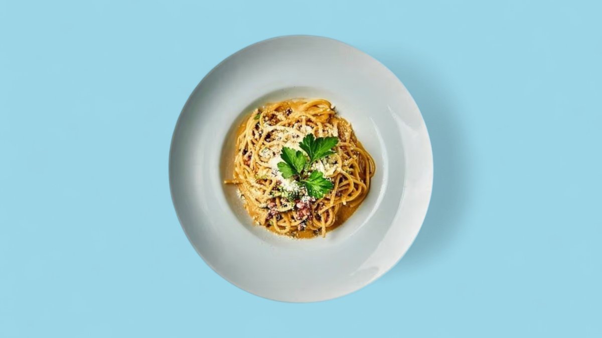 Spaghetti in einer cremigen SoĂźe aus Speck vom Schwein, gekochtem Ei, frisch gemahlenem schwarzem Pfeffer und Parmesan, verfeinert mit gehackter Petersilie