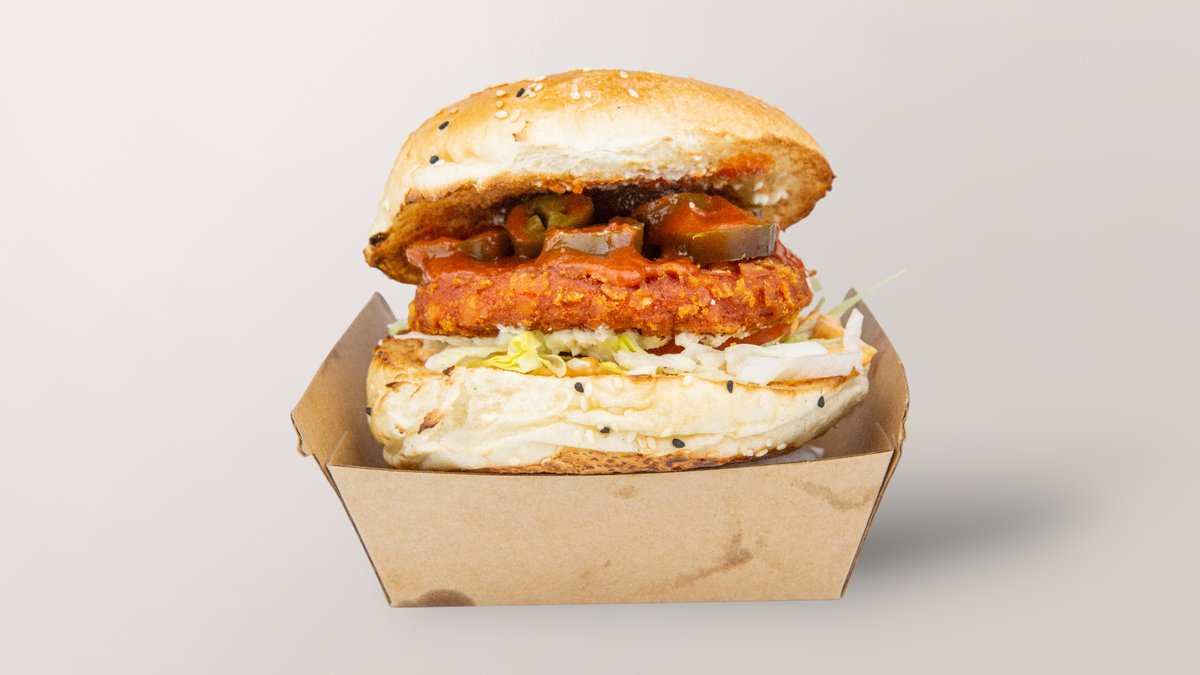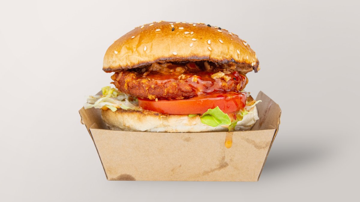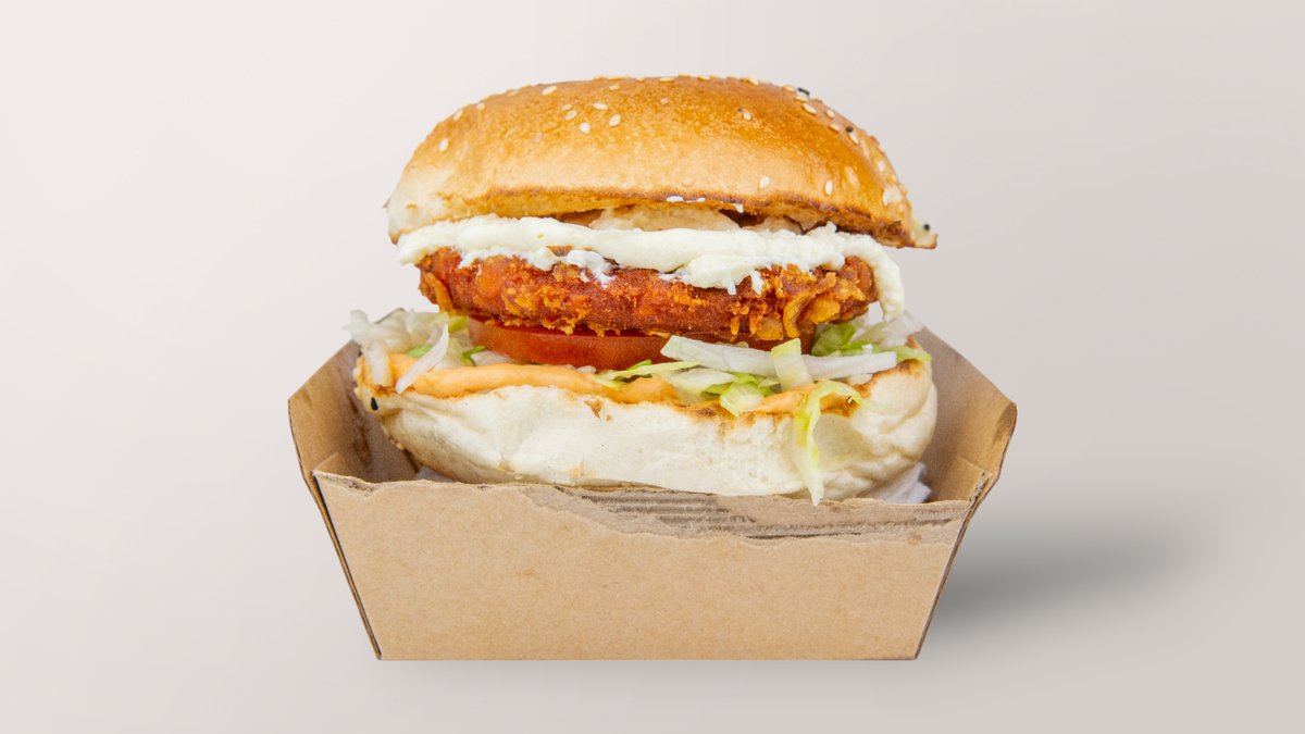 mit knusprigem Hähnchen, Röstzwiebeln, Mayonnaise und Süß-Sauer-Soße