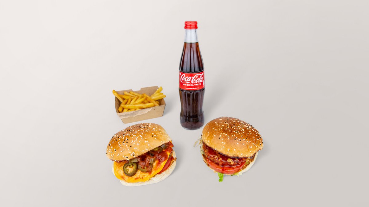 2x Burger 1x Pommes frites 1x alkoholfreies Getränk 0,2 l deiner Wahl