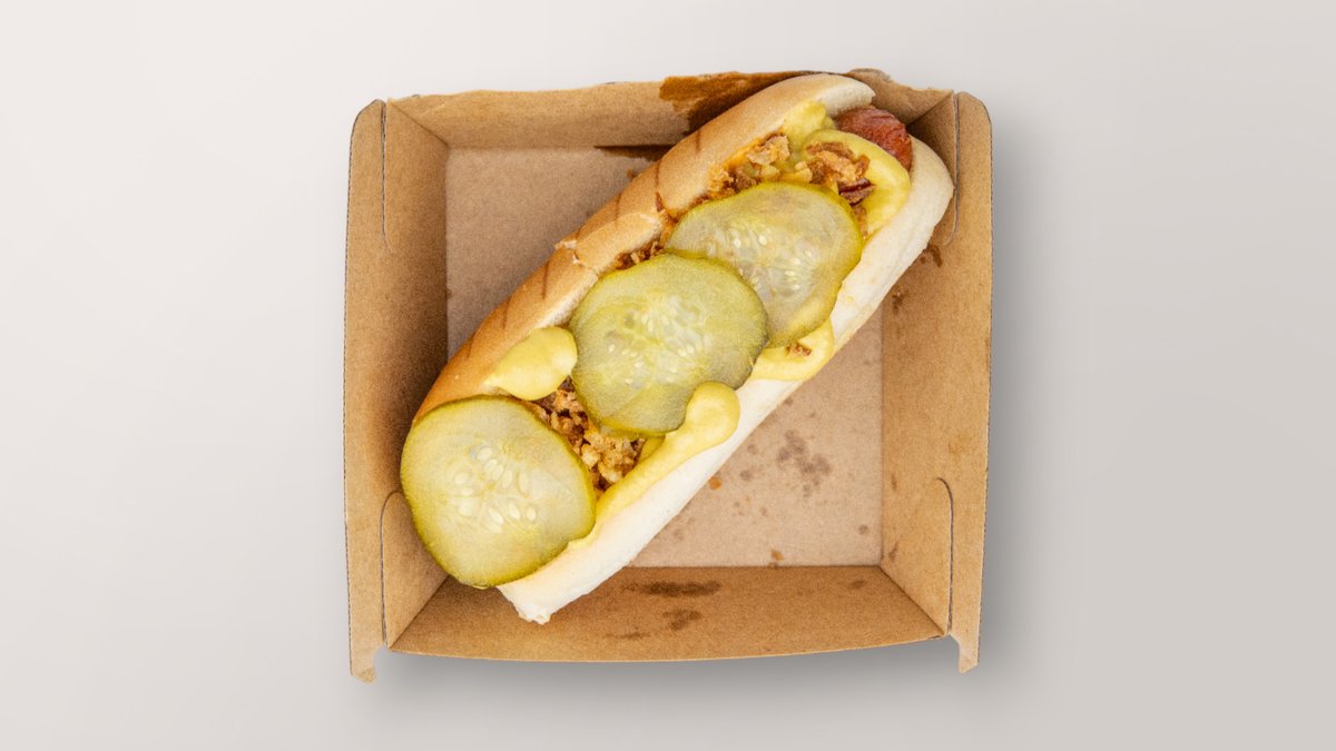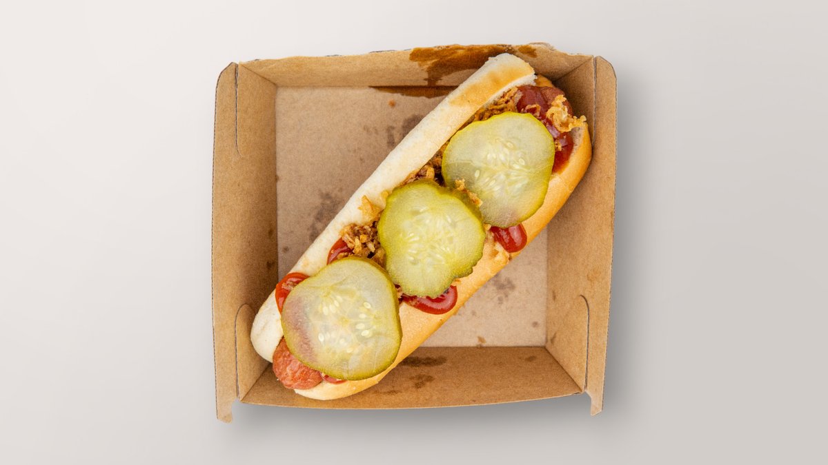 mit GeflĂĽgelwurst, Zwiebeln, GewĂĽrzgurken, Senf und hausgemachter SoĂźe