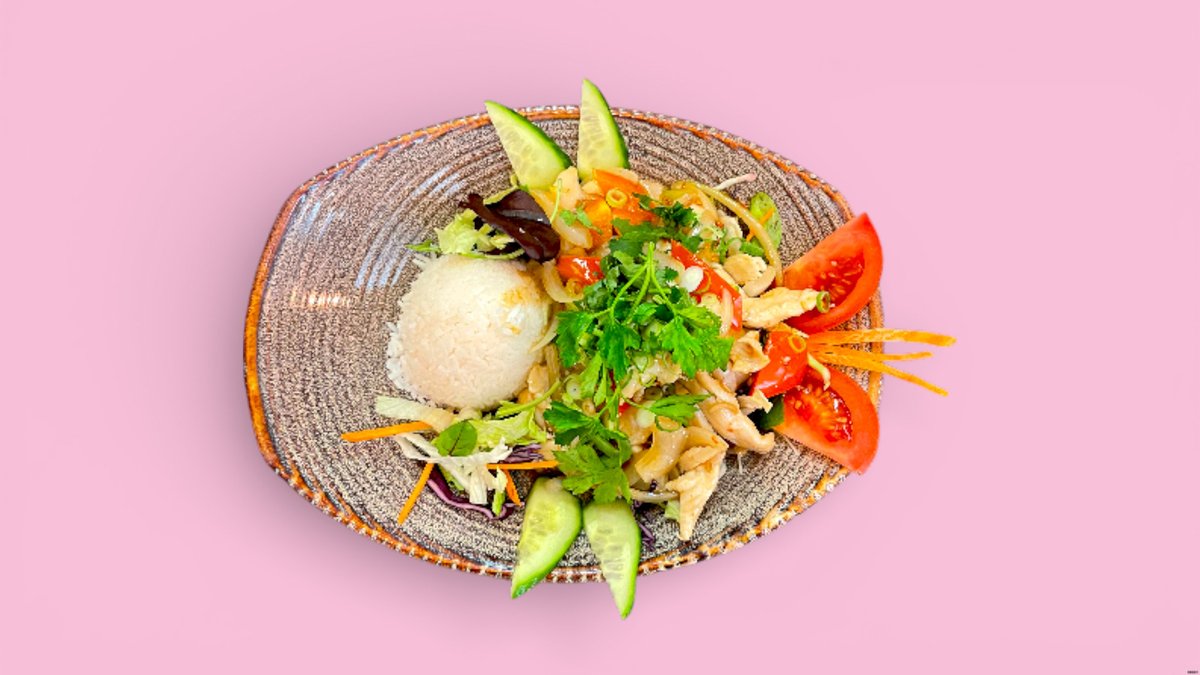 grüner Mangosalat mit roten Zwiebeln, Möhren, Erdnüssen, Pfefferminz, Koriander, Chili, Limetten-Dressingsoße und einer Zutat deiner Wahl