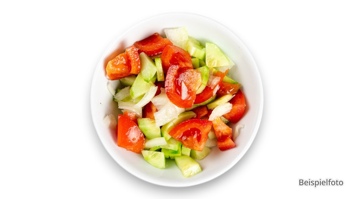 Gurke, Kirschtomaten, rote Zwiebel, Croutons, Pinienkerne und Balsamico Dressing