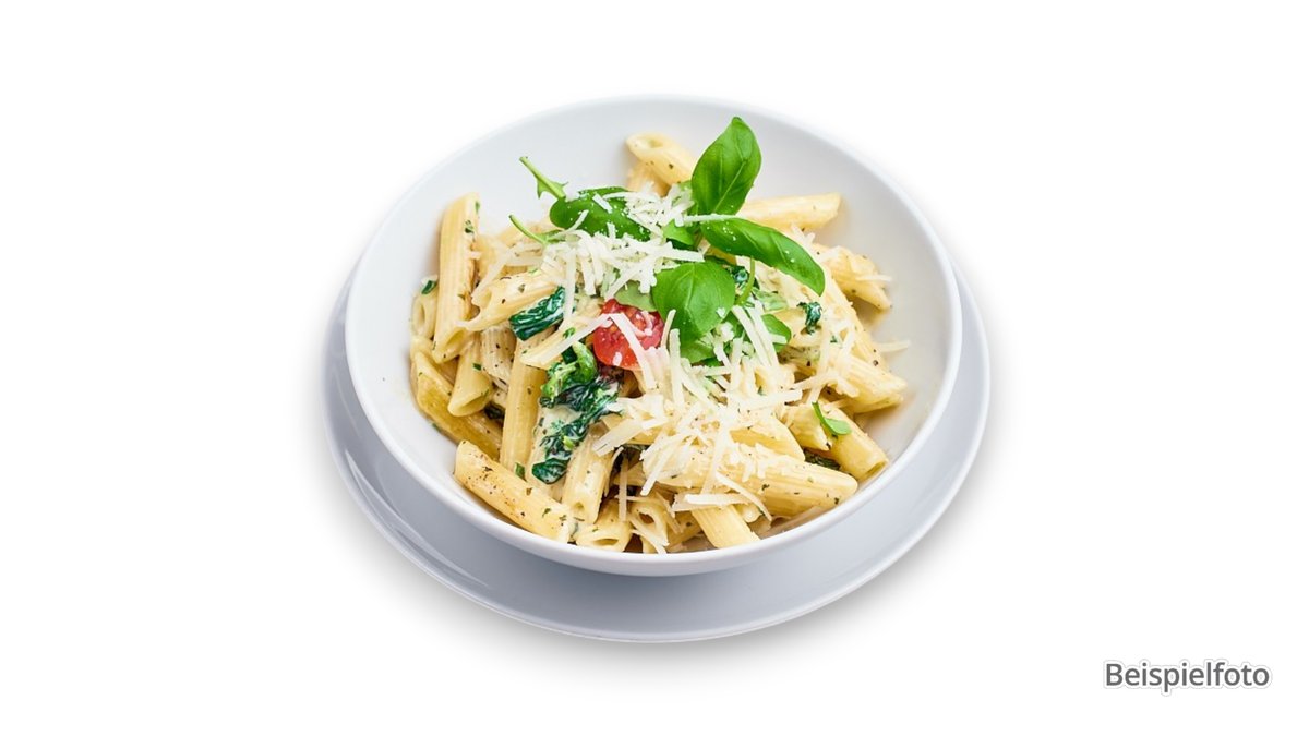 mit Hähnchenbruststreifen, getrocknete Tomaten, Pinienkerne, Rucola, Basilikum-Pesto, Sahne und geraspelter Parmesan