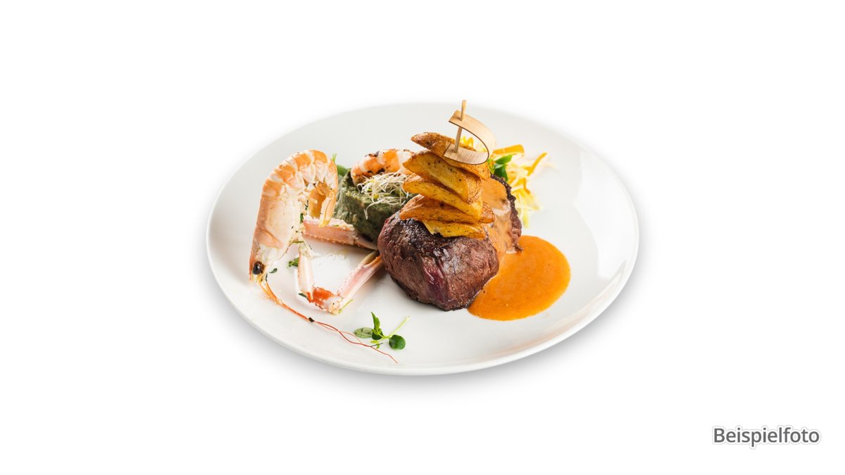 zartes Rinder-Filet gegrillt mit einer Garnele, Kartoffelgratin, Cognac-Jus, Brokkoli-Röschen und Knoblauch-Chips Enthält Alkohol, für Kinder und schwangere Frauen nicht geeignet|
