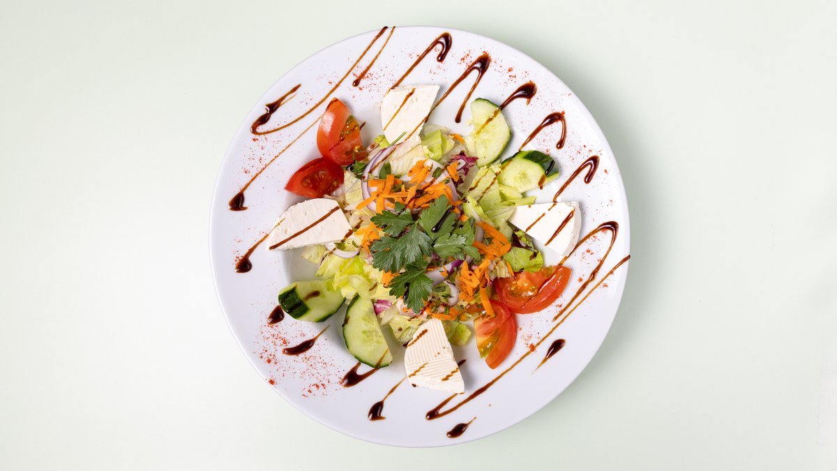 alle Salate sind frisch, grün und werden mit Tomaten, Gurken, Zwiebeln und Haussdressing (Olivenöl, Senf, Honig, Orangensaft und Balsamico-Essig) zubereitet