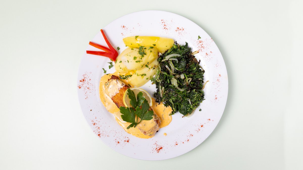 mit Knoblauch, Weißwein-Hummersoße, frischen Spinat und Salzkartoffeln Enthält Alkohol, für Kinder und schwangere Frauen nicht geeignet