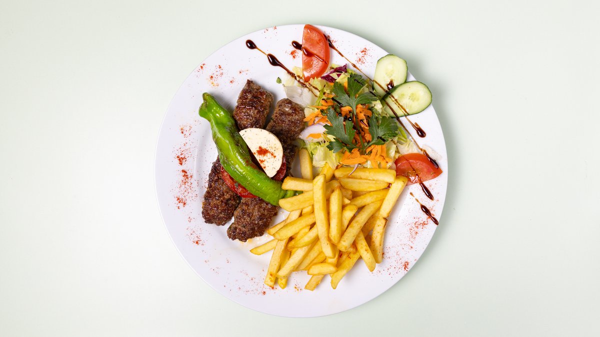 saftig gegrilltes Hackfleisch vom Rind am Spieß, herzhaft gewürzt, mit Joghurt, Tomatensoße, hausgemachter Kräuterbutter, gegrillten Tomaten, Peperoni, Salatbeilage und Reis