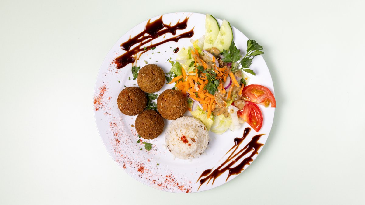 mit 4 knusprigen Falafebällchen, Salatbeilage, Soße und Beilage deiner Wahl