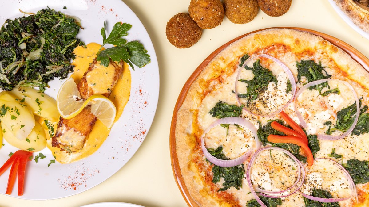 mit knusprigen Falafelbällchen, gegrilltem Halloumi, frischem Salat, Tomaten, Gurken, Zwiebeln, Soße und Beilage deiner Wahl