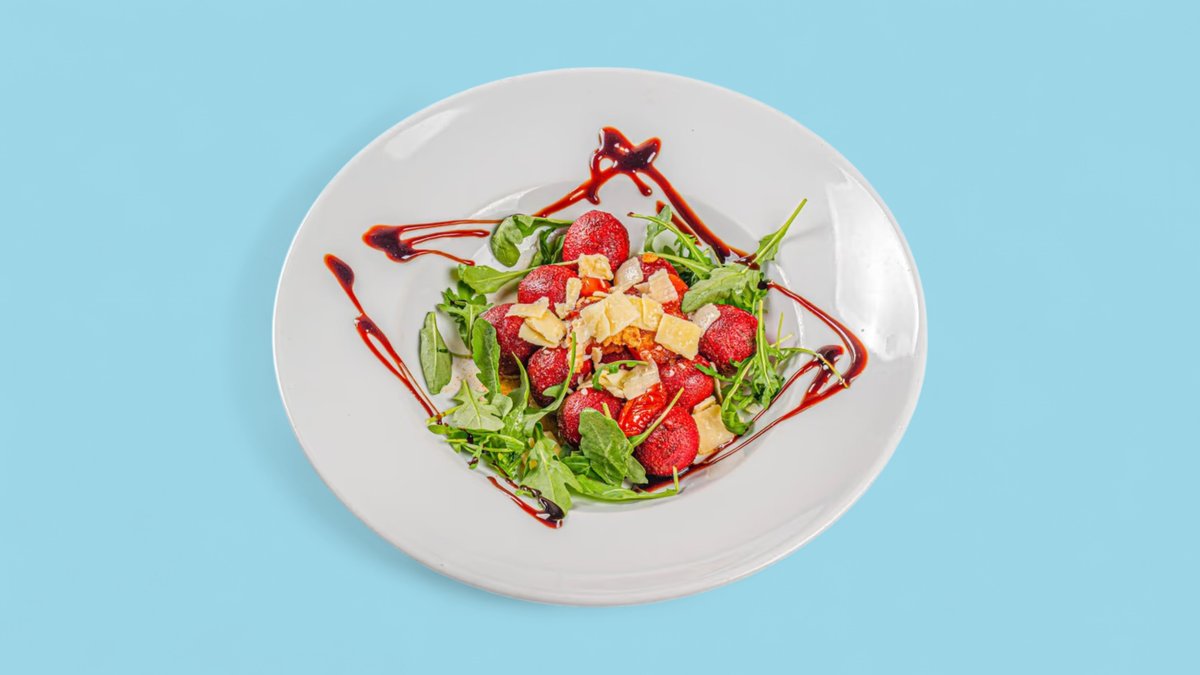 Fein aufgeschnittene Rote Bete mit cremigem Ziegenkäse, frischen Wildkräutern und unserem fruchtigen Himbeer-Dressing