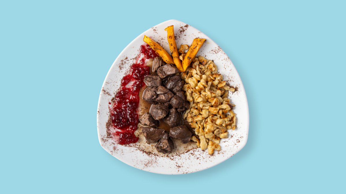 aus Brandenburgs Wäldern - mit Rotwein und etwas Zartbitterschokolade zart gegart - angebratenen Spätzle mit Hokkaidokürbis aus dem Ofen Enthält Alkohol, für Kinder und schwangere Frauen nicht geeignet