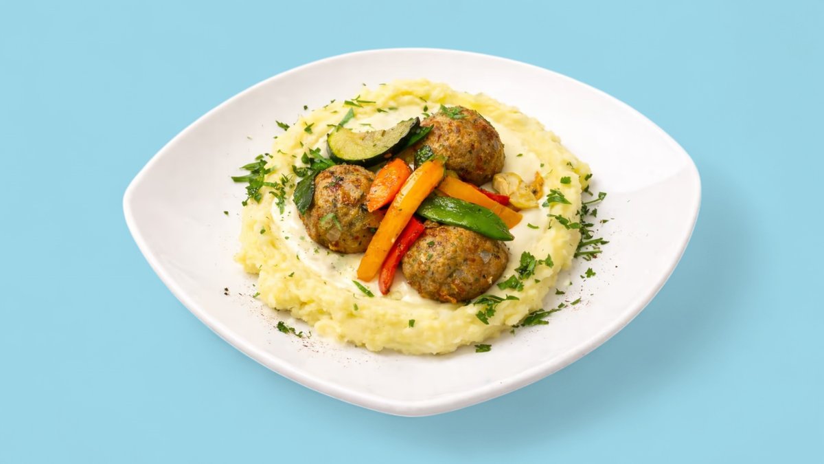 hausgemachte Fleischklopse aus Kalb- und Schweinefleisch (80 % Kalb) in klassischer Kapernsoße, serviert mit cremigem Kartoffelpü- ree und Rote-Bete-Salat