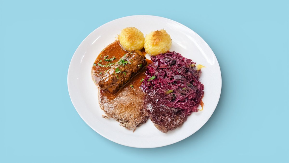 zartes Rindfleisch gefüllt mit Senf, Gurke und Zwiebel, langsam geschmort. Dazu Rotkohl und mediterrane Kartoffelklöße
