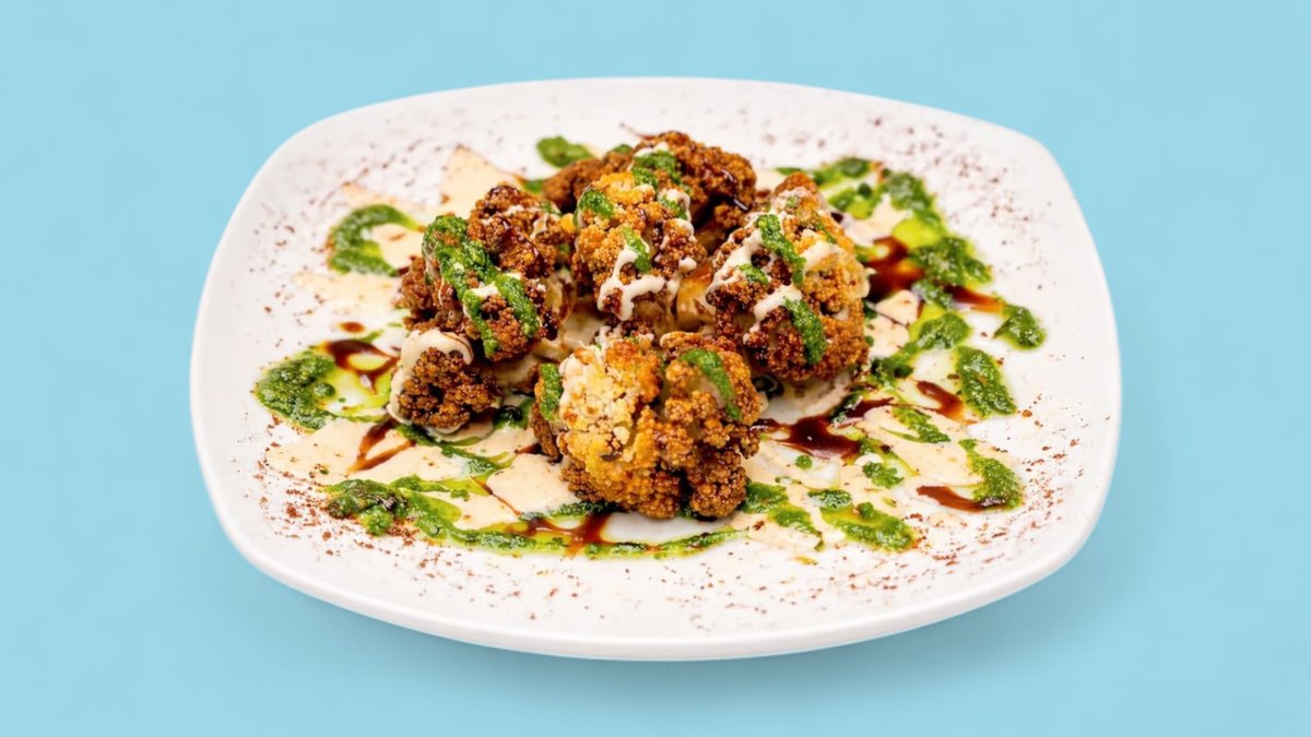 knusprig frittiert, mit hausgemachter Tahina, grünem Pesto und Granatapfelsoße