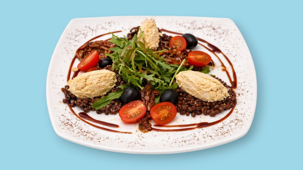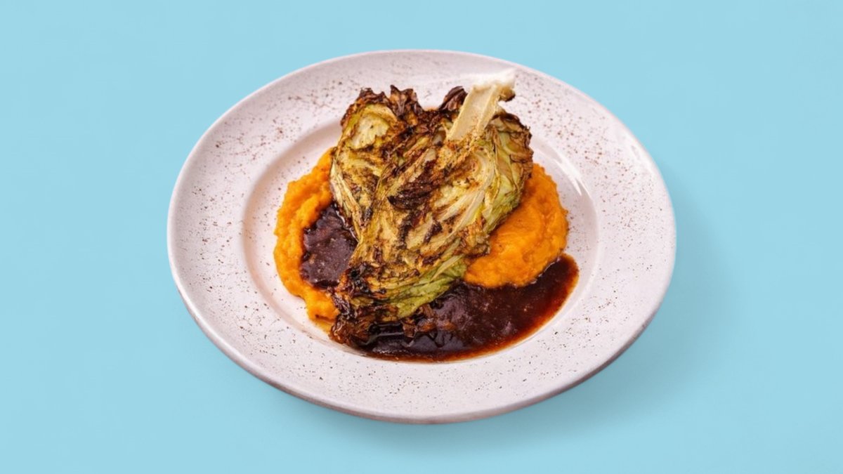 zart gegrillter Spitzkohl auf cremigen Süßkartoffeln, abgerundet mit einer aromatischen, hausgemachten Pflaumen-Demi-Glace