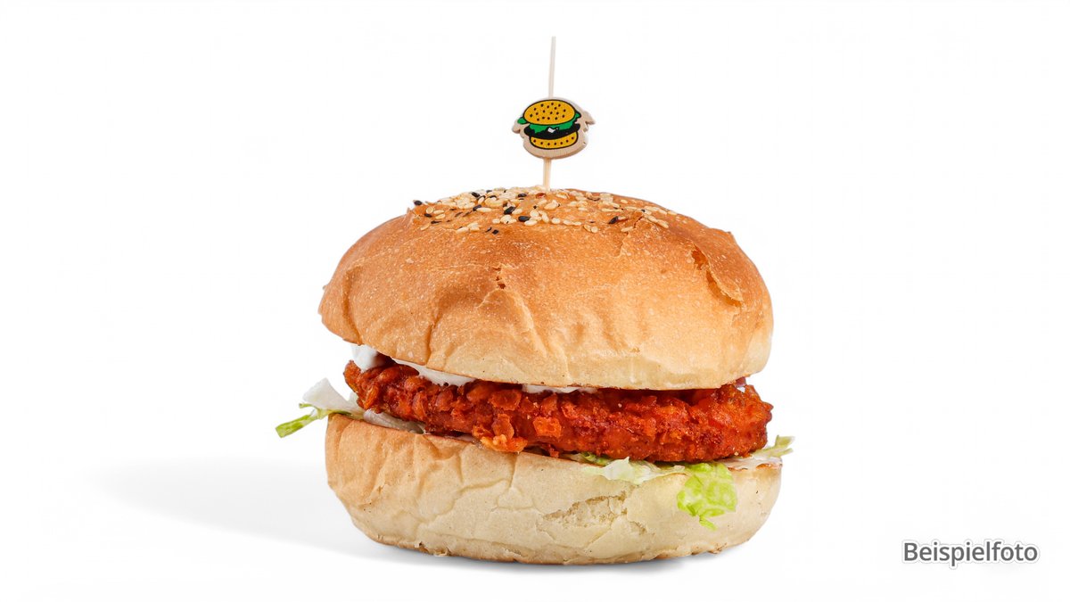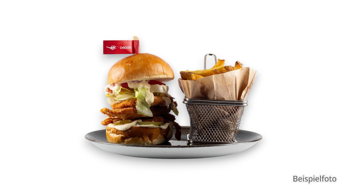 alle Burger werden mit Burgerbrötchen, Salat und Tomaten zubereitet („Crispy Chicken Burger“ wird ohne Tomaten zubereitet)