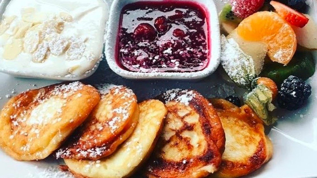 5 Stück Syrniki (Quarkpfannkuchen) mit hausgemachter roter Grütze, Vanille-Mandelquark und frischem Obst