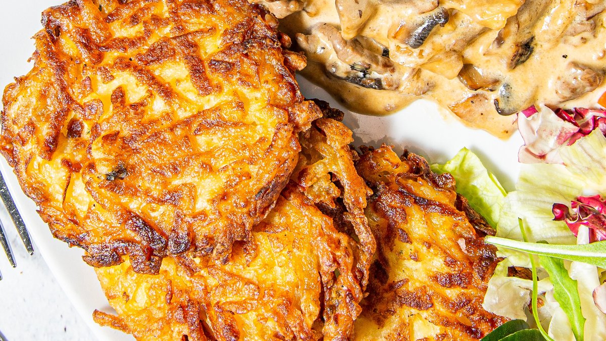 2 Stück hausgemachter Kartoffelpuffer, Mozzarella Tomaten und Balsamico, frittierte Champignons, frittierte Teigtaschen mit Geflügelfleischfüllung, geräucherter Lachs, Meerrettich, Cocktailsauce und Brotkorb