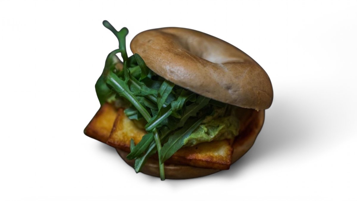 mit knusprigem Halloumi, hausgemachtem pikantem Tomaten-Relish, Avocado, Rucola und eingelegten roten Zwiebeln