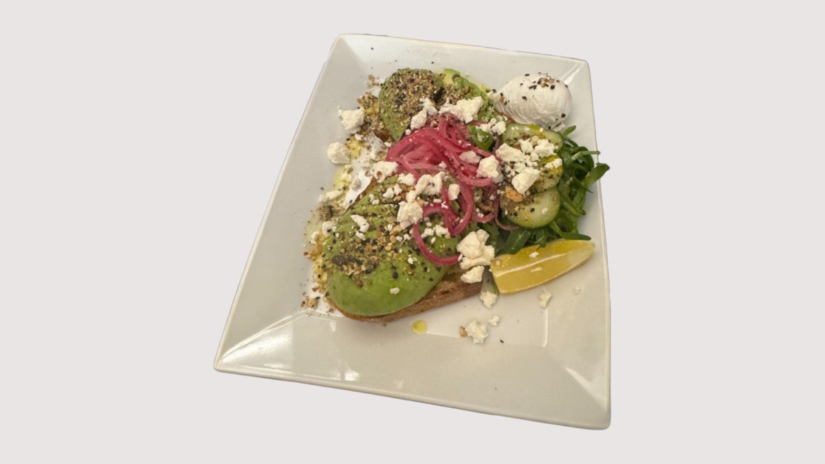 mit Avocado auf Sauerteigbrot und mit Dukkah (gemahlene Nüsse/Gewürze/Samen), garniert mit eingelegten roten Zwiebeln und frischem Rucola