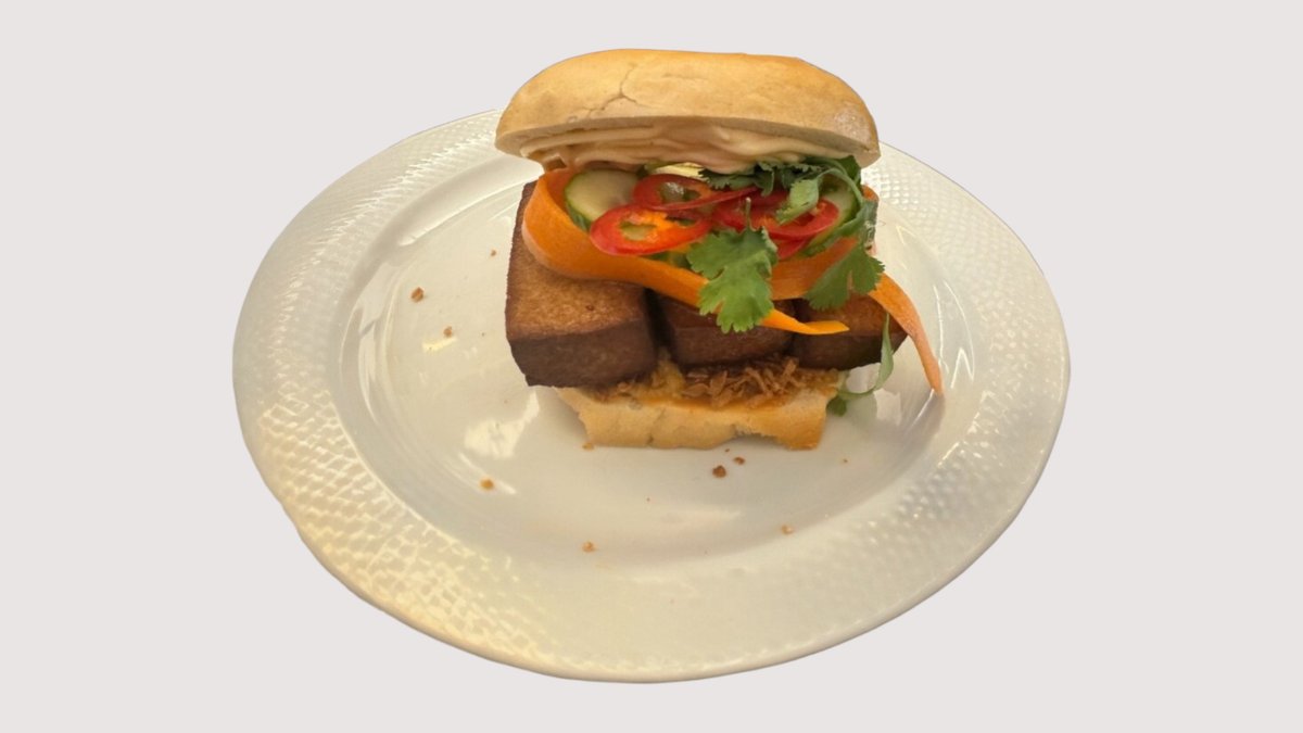 marinierter knuspriger Tofu, siracha mayo, Satay, pickled veg, knusprige Zwiebeln, Koriander, Cilli, garniert mit eingelegten roten Zwiebeln und frischem Rucola